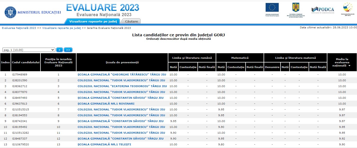 Șase elevi din Gorj au reușit să obțină media 10 la Evaluarea Națională din acest an. Rezultatele au fost publicate cu anonimizarea numelui și prenumelui candidaților.