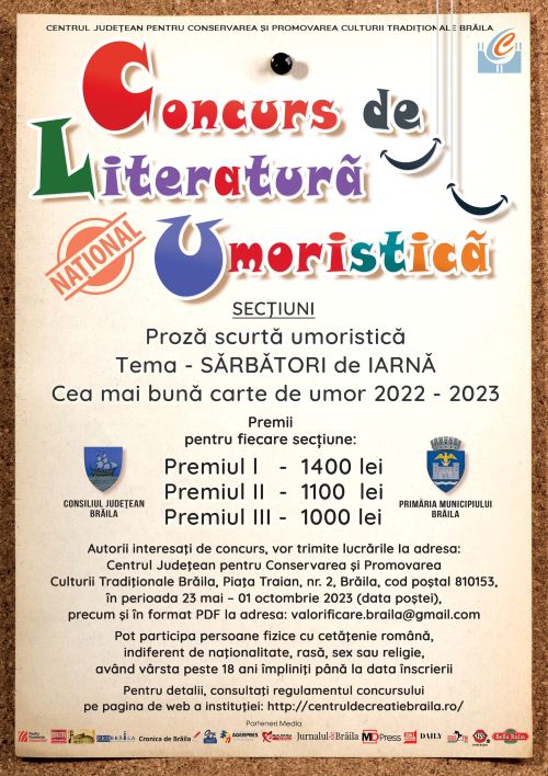 Consiliul Județean Brăila și Centrul Județean pentru Conservarea și Promovarea Culturii Tradiționale Brăila, au organizat în perioada mai-noiembrie 2023, cea de-a VII-a ediție a Concursului Național de Literatură Umoristică, pe două secțiuni: Cea mai bună carte de umor în perioada 2022-2023 și Proză scurtă umoristică.