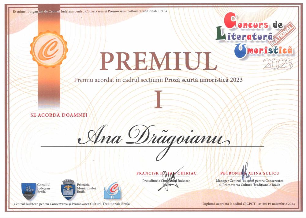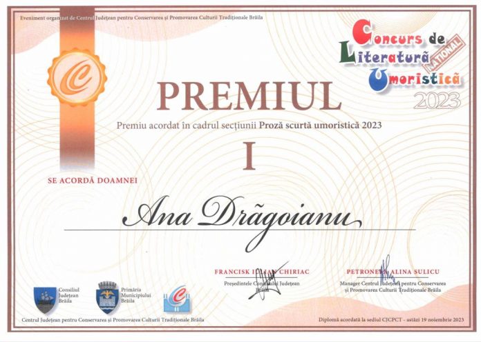 Dacă la ediția a V-a a Concursului Național de Literatură Umoristică de la Brăila din anul 2021, gorjeanca Any Drăgoianu a obținut premiul II, anul acesta, în 2023, la a VII-a ediție, a reușit să obțină locul I la secțiunea Proză scurtă umoristică. De altfel, așa cum spunea doamna Any Drăgoianu, ea a participat la toate edițiile acestui concurs și doar în anul 2019 nu a fost pe podium, în rest, a fost la fiecare ediție premiată.
