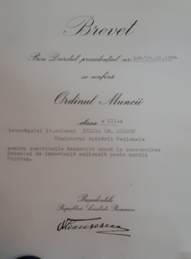 Pentru merite deosebite și contribuția adusă la realizarea drumului Transfăgărășean, Consiliul de Stat al Republicii Socialiste România a conferit „Ordinul Muncii” unor cadre militare, care s-au remarcat în muncă pentru realizarea acestui important obiectiv economic național. Printre ofițerii care au primit „Ordinul Muncii” clasa a III-a la 14.09.1974, a fost și locotenent-colonelul LIESCU Iulică, locțiitorul pentru servicii al comandantului Regimentului 52 Geniu.