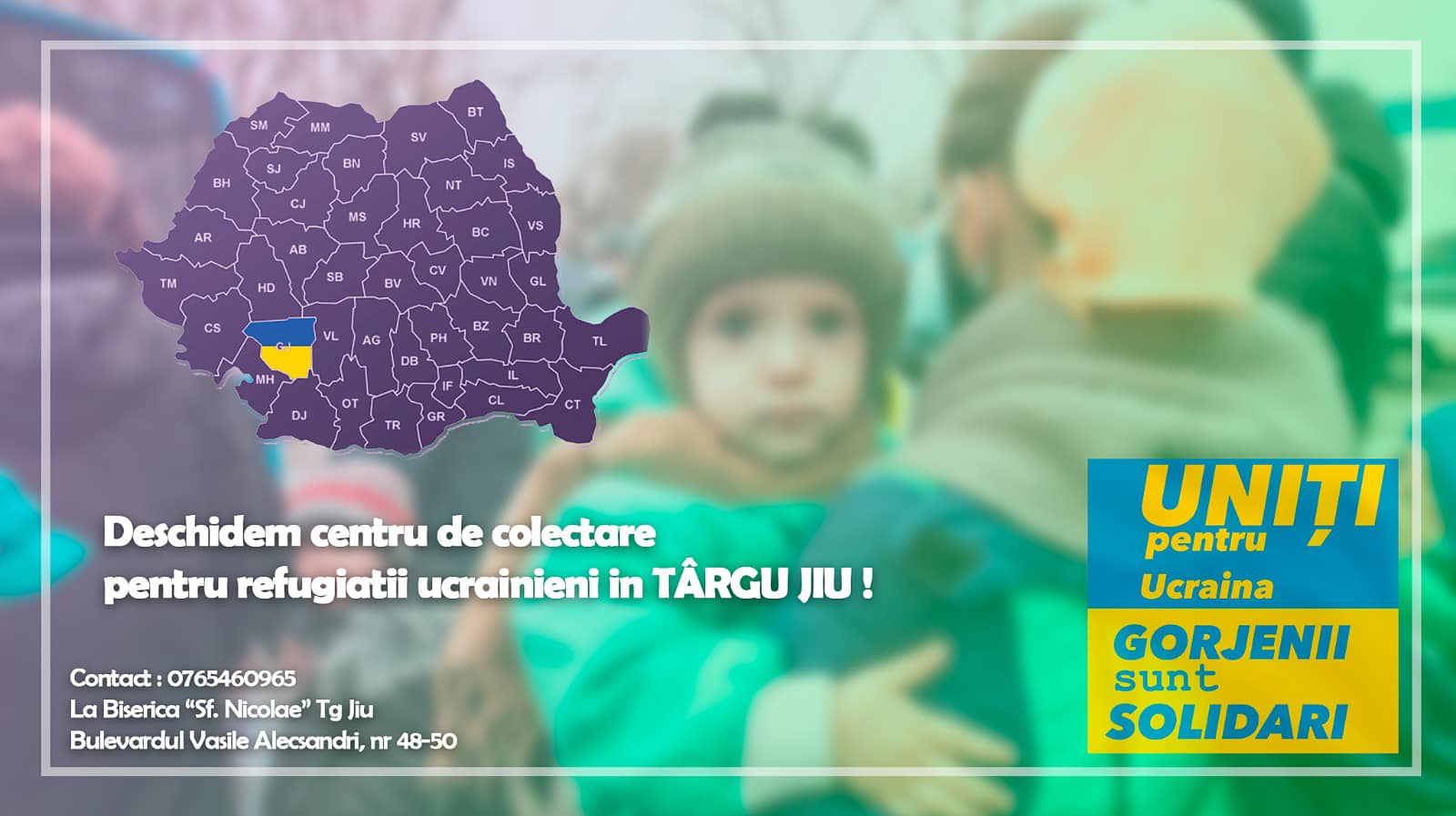 În judeţul Gorj au fost deschise mai multe centre pentru colectarea de ajutoare pentru refugiații ucraineni. Ele funcționează la Târgu-Jiu, Motru, Rovinari, Novaci şi Polovragi. De asemenea, Colegiul Național Tudor Vladimirescu din Târgu-Jiu a lansat campania umanitară „Solidari cu Ucraina”. Toți cei care doresc să ajute pot duce la biblioteca colegiului prosoape, pături, pilote, perne, lenjerii de pat, căciuli, șosete (noi sau foarte puțin folosite), măști de unică folosință, dezinfectant, gel antibacterian, șervețele umede/uscate, pastă de dinți, periuțe de dinți, șampon, gel de duș, săpun, produse de igienă intimă, detergent haine, detergent vase, bureți vase, veselă de unică folosință etc.