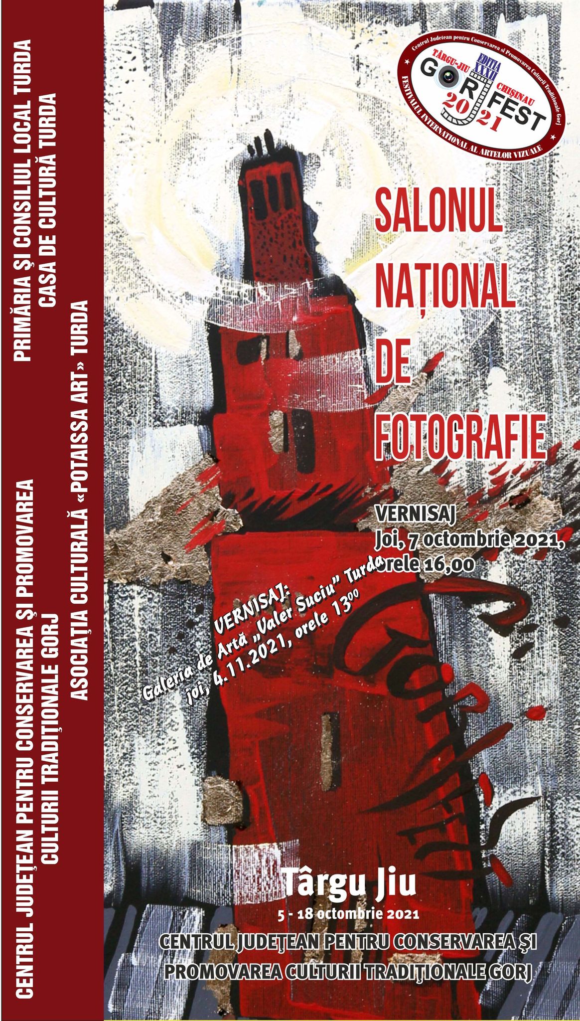 Centrul Județean pentru Conservarea și Promovarea Culturii Tradiționale Gorj va organiza joi, 4 noiembrie, începând cu ora 13.00, vernisajul Salonului Național de Fotografie din cadrul GORJFEST 2021, la Turda. Ediția din acest a GORJFEST a început în data de 7 septembrie 2021, la Galeria Artcor din Chișinău, cu vernisarea unei expoziții de pictură, grafică, fotografie și sculptură „Columna neamului românesc de la Ștefan cel Mare la Constantin Brâncuși”.