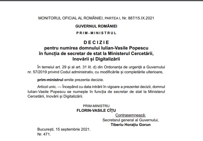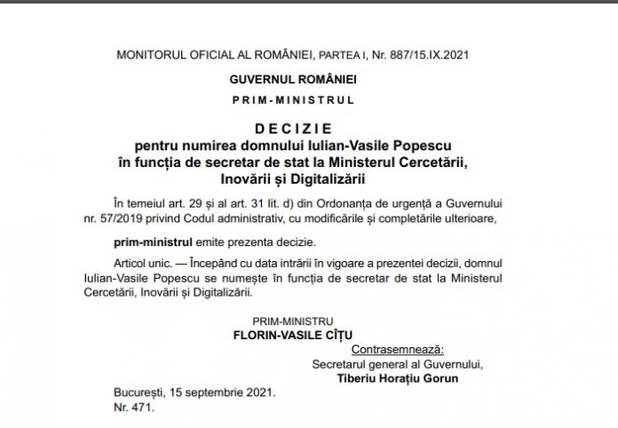Iulian Popescu, vicepreședintele PNL Gorj, a fost numit miercuri în funcția de secretar de stat la Ministerul Cercetării, Inovării și Digitalizării. El a fost eliberat din funcția de consilier de stat în cadrul Cancelariei Prim-Ministrului pentru a ocupa noul post.