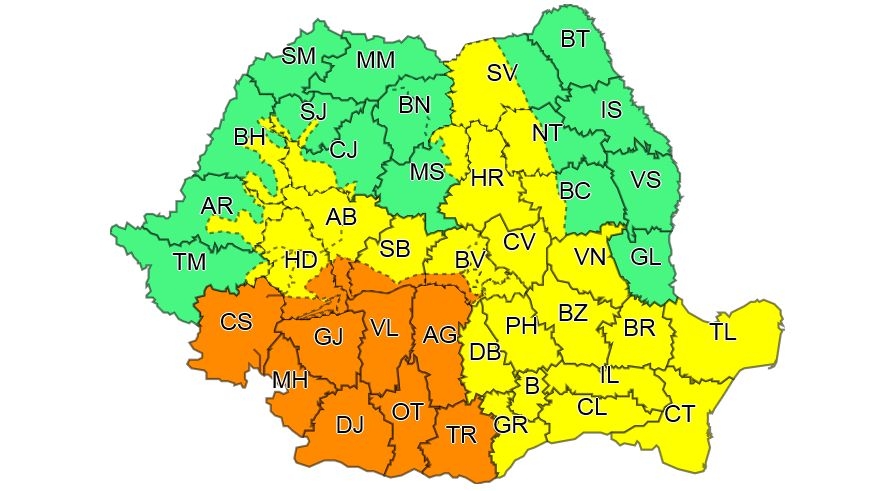 Administrația Națională de Meteorologie a emis un cod portocaliu de ninsori valabil de luni ora 2:00 până miercuri la ora 10.00, în 12 județe din țară, între care și Gorj.