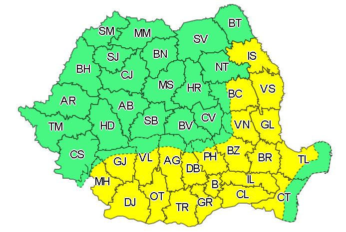Atenţionarea vizează judeţele Iaşi, Bacău (parţial), Vaslui, Vrancea (parţial), Galaţi, Buzău, Brăila, Tulcea şi Constanţa (parţial), Ialomiţa, Călăraşi, Prahova, Giurgiu, Dâmboviţa, Teleorman, Argeş, Vâlcea, Gorj şi Mehedinţi (parţial), Dolj, Olt, Ilfov şi Municipiul Bucureşti.