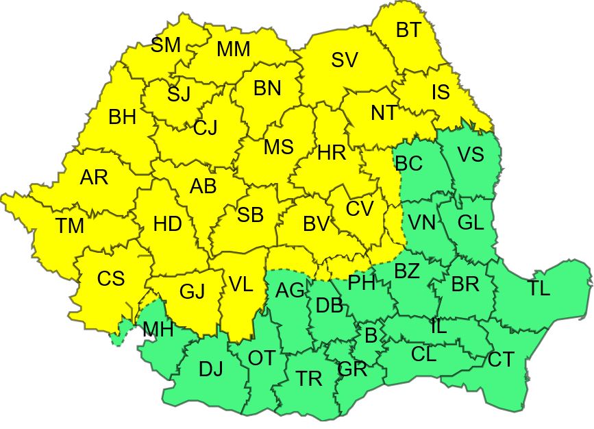 Un număr de 23 de judeţe se află sub Cod galben de instabilitate atmosferică pe parcursul zilei de joi, în intervalul orar 10:00 – 22:00, potrivit unei avertizări actualizate de Administraţia Naţională de Meteorologie. În aceste zone, vor fi averse ce vor avea şi caracter torenţial, descărcări electrice, vijelii şi condiţii de grindină. Cantităţile de apă vor mai depăşi local 20…25 l/mp şi izolat 40 l/mp.