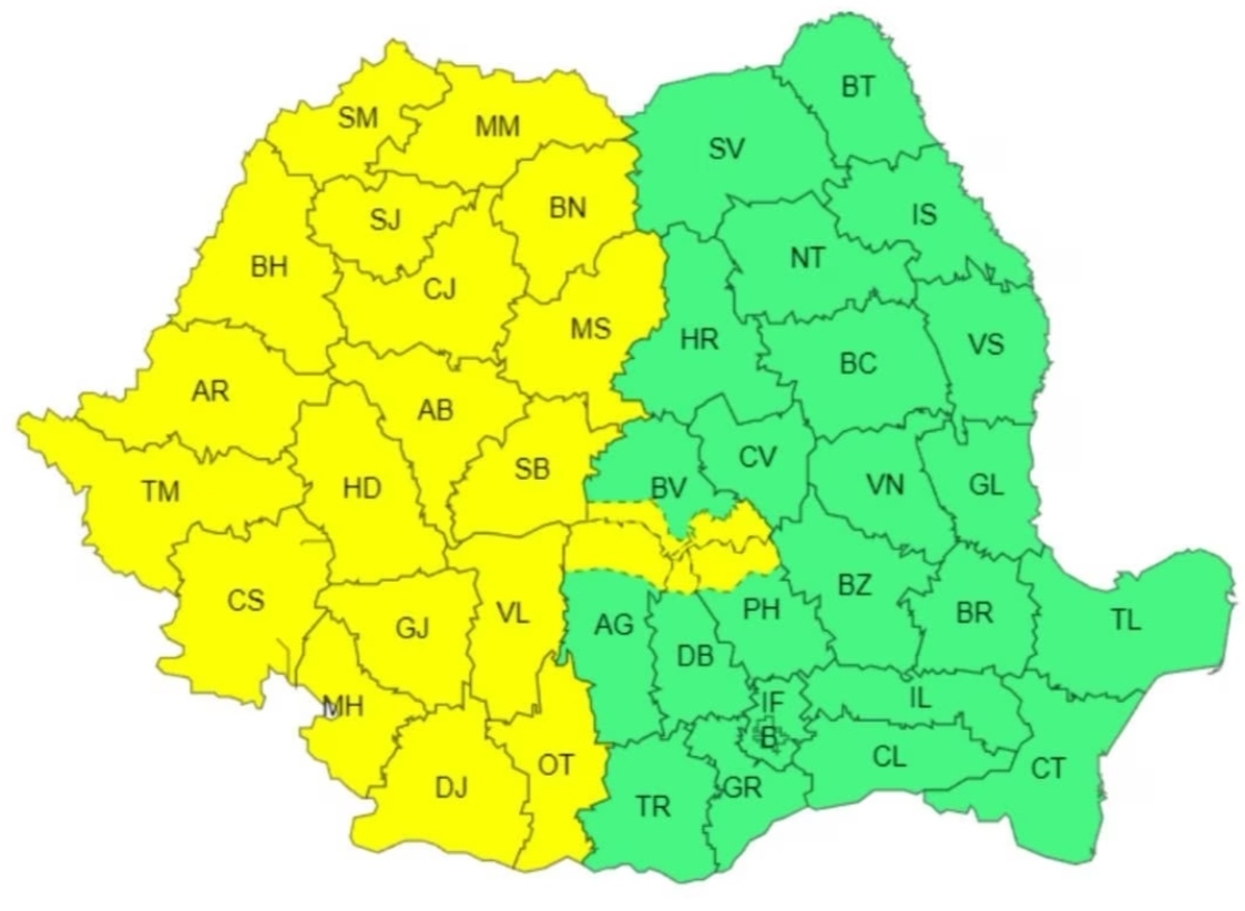 Din această seară, de la ora 20 şi până marţi la ora 8, jumătate de ţară intră sub cod galben de vijelii şi intensificări ale vântului. În intervalul menționat vântul se va intensifica treptat în Banat, Crișana, Oltenia, jumătatea vestică a Transilvaniei și în Maramureș, cu viteze de 55…65 km/h și pe arii restrânse 70 km/h, iar în a doua parte a nopții va avea aspect de vijelie. În Carpații Occidentali și în Carpații Meridionali, la altitudini mari, rafalele vor depăși 100…110 km/h.