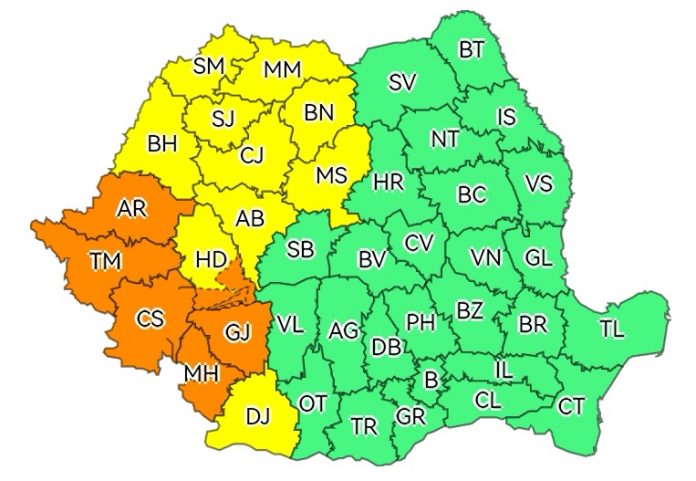 În județele Timiș, Arad, Caraș Severin, Mehedinți, Gorj și zona de munte a județului Hunedoara vor fi averse torențiale, iar în intervale scurte de timp sau prin acumulare se vor înregistra cantități de apă de 40…50 l/mp și izolat de peste 70 l/mp