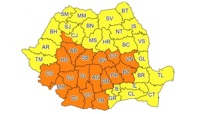 „De la ora 16:00 de astăzi şi până marţi la ora 21:00, ne aflăm sub incidenţa unei avertizări meteorologice de cod portocaliu pentru 18 judeţe din partea de sud a ţării, Oltenia, vestul şi nordul Munteniei, sudul şi vestul Transilvaniei precum şi jumătatea de sud a Banatului şi în sud-vestul Moldovei. În acest interval vor fi ploi abundente, se vor acumula cantităţi de apă de 40-50 de litri pe metrul pătrat şi pe arii restrânse 70 de litri/mp”, a declarat, duminică, reprezentantul ANM, citat de Mediafax.