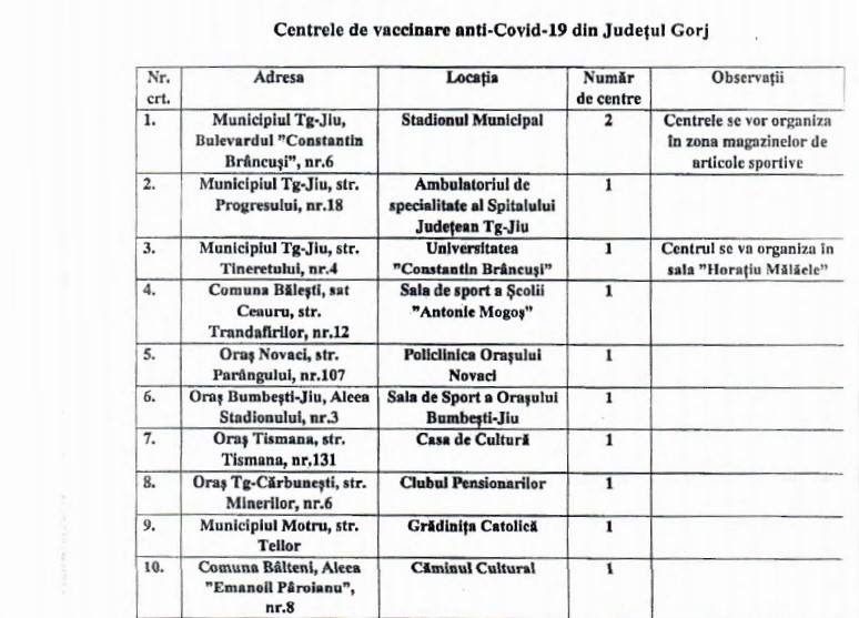 „Centrele s-au stabilit printr-o hotărâre a Comitetului Județean pentru Situații de Urgență. Astfel, în județul Gorj avem 11 centre pentru vaccinare. Patru dintre aceste centre sunt în municipiul Târgu-Jiu, iar restul sunt în Novaci, Târgu Cărbunești, Motru, Bălești și Bâlteni. Decizia s-a luat la nivel național pentru fiecare județ în funcție de numărul persoanelor cu vârstă mai mare de 60 de ani, persoanele vulnerabile. Astfel, localitățile unde numărul acestor persoane era mare, acolo au fost stabilite și centrele respective”, a declarat Corina Belteu, purtătorul de cuvânt al Prefecturii Gorj.