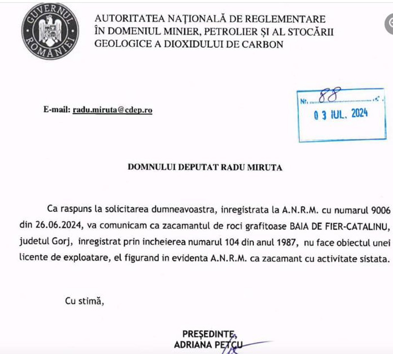 ANRM: ,,Zăcământul de roci grafitoase Baia de Fier – Cătălinu nu face obiectul unei licențe de exploatare, el figurând în evidența ANRM ca zăcământ cu activitate sistată”