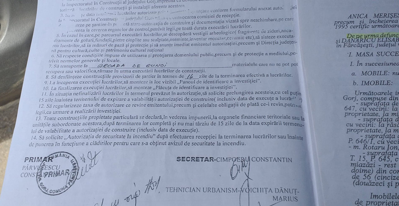 Autorizația s-a eliberat însă în decembrie, la trei luni după moartea proprietarului de drept. În baza acestui document nul, în Peșteana de Jos s-a edificat construcția în cauză, construcție care nu respectă legislația și pune în pericol și proprietatea vecinului.