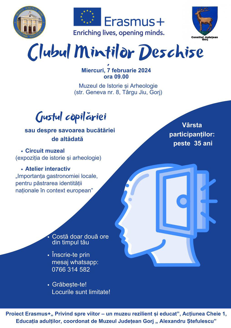 Muzeul Județean Gorj „Alexandru Ștefulescu” continuă activitățile din Clubul Minților Deschise, care are în dezbatere o nouă temă: „Gustul copilăriei, sau despre savoarea bucătăriei de altădată”. Activitatea va avea loc mâine, 7 februarie, începând cu ora 09:00, la sediul muzeului, din strada Geneva nr. 8, Târgu Jiu, și are în program: – vizitarea expoziției de istorie și arheologie, cu accent pe modul de preparare a hranei pe teritoriul județului Gorj, din Preistorie până în Epoca Contemporană; – atelierul interactiv „Importanța gastronomiei locale, pentru păstrarea identității naționale în context european”. Participarea este gratuită, cu înscriere pe whatsapp, la numărul de telefon 0766314582. Vârsta minimă a participanților este 35 de ani. Programul Clubul Minților Deschise face parte din proiectul Erasmus+ „Privind spre viitor – un muzeu rezilient și educat”, din cadrul Acțiunii cheie 1, Educația adulților, coordonat de Muzeul Județean Gorj „Alexandru Ștefulescu”.