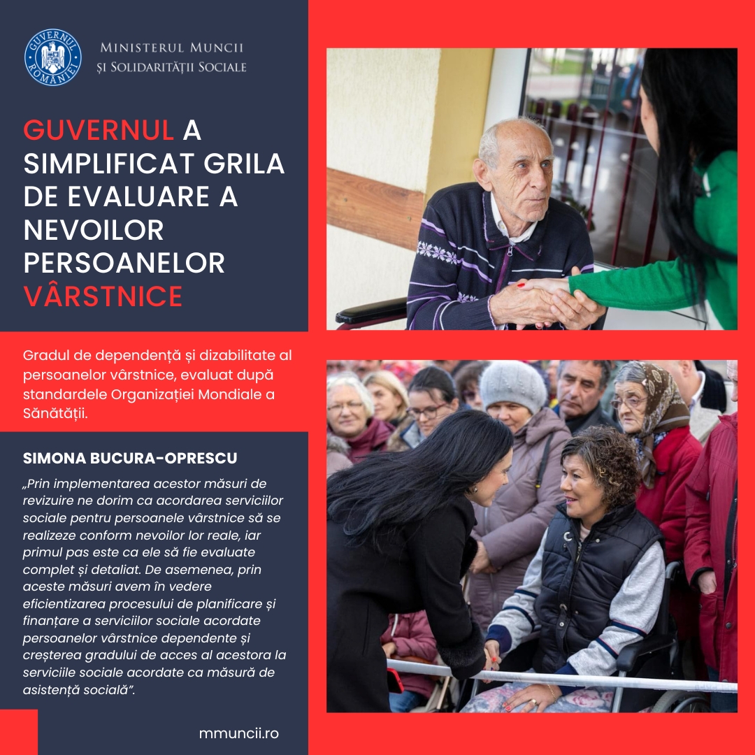 Guvernul a simplificat, la propunerea Ministerului Muncii și Solidarității Sociale, Grila națională de evaluare a nevoilor persoanelor vârstnice, și a revizuit instrumentele standard de evaluare a nevoilor acestor persoane, respectiv criteriile de încadrare în grade de dependenţă și fişa de evaluare socio-medicală. Modificările au fost propuse în contextul în care această grilă nu a mai fost actualizată din anul 2000. Grila naţională de evaluare a nevoilor persoanelor vârstnice este utilizată în încadrarea persoanelor vârstnice în grade de dependență și în elaborarea planului individualizat de îngrijire și asistență.