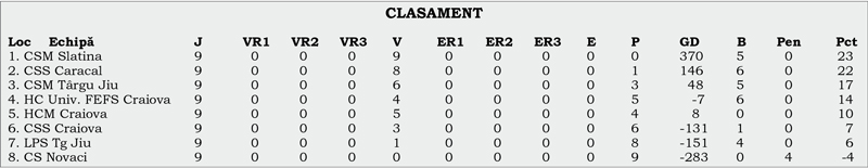 Junioarele 3 de la CSM Târgu Jiu au obţinut un succes important, la sfârşitul săptămânii trecute, în Sala „Ion Constantinescu” din Craiova. Echipa pregătită de Radu Costel a trecut fără probleme de HC FEFS Craiova, scor 21-36. Echipa vizitatoare a câştigat toate cele trei perioade de joc: 5-12, 9-13, 7-11. Cea mai bună marcatoare a gorjencelor a fost din nou Alesia Cişmaşu, care a izbutit 13 goluri. A fost secondată de Raluca Chiriac, cu 12 reuşite. Victoria din Bănie a consolidat locul 3 în clasament pentru CSM Târgu Jiu.