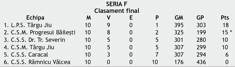 Reprezentanta Doljului, principala contracandidată la titulatura de campioană a Grupei F, a luptat din răsputeri, uneori și până la limita regulamentului, însă sorții și maturitatea în joc a elevilor târgujieni au decis: L.P.S. Târgu Jiu învingătoare cu 37-34, după ce în prima repriză oaspeții aveau un ecart avantajos de 4 goluri, scor 13-17. Ultima etapă a turului nu a avut istoric, formația din Vâlcea fiind cea care a făcut doar act de prezență pe parchet în toate cele 5 etape ale turului, linia clasamentului arâtând cifra zero în dreptul punctelor.