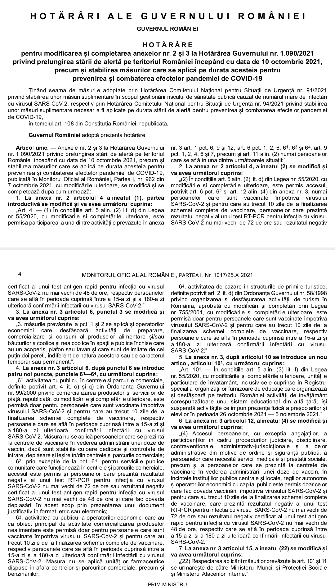 „La mall-uri, la intrare, la centrele comerciale este obligatorie verificarea certificatului verde, de vaccinare sau trecere prin boală. Se va permite accesul, prin excepție, în centrele și parcurile comerciale, a persoanelor care se deplasează la centrele de vaccinare, în vederea administrării unei doze de vaccin și numai dacă sunt stabilite culoare dedicate și controlate de intrare, deplasare și ieșire din mall. Adică, se va putea intra la un centru de vaccinare, dar trebuie organizat astfel: se intră, se vaccinează, se iese din mall. Mai e o excepție pentru centrele, mall-urile, unde există servicii publice, administrative, cum este, de exemplu serviciul public de pașapoarte. Acolo se poate intra cu test valabil și cu dovada programării la centrul de pașapoarte sau la centrul de servicii comunitare, care există în interiorul mall-ului. Referitor la accesul la alte magazine, cu excepția celor alimentare: atenție, în mall, la magazinele alimentare nu se poate intra decât pe baza certificatului verde, adică vaccinat sau trecut prin boală! Însă, în afara mall-ului, se poate intra la magazinele alimentare, la centrele care vând alimente doar cu masca, deci respectând regulile sanitare. La orice alt magazin sau operator economic, care comercializează alte produse, aici exceptând farmaciile, acolo se intră doar cu certificatul verde. Deci magazinele care sunt pe șosele, pe Calea Victoriei, cu tot, în afara celor alimentare care vând alimente, se intră acolo numai cu certificatul verde, vaccinat sau trecut prin boală. Dacă sunt centre comerciale cu magazine cu acces direct din stradă, cu excepția celor care vând alimente, magazinele respective au obligația să verifice certificatul verde la intrare. (…) Pe lângă acest lucru, activitatea de cazare în structurile de primire turistică va fi permisă doar pentru persoanele care sunt vaccinate sau trecute prin boală, adică, certificat verde, vaccinat sau trecut prin boală pentru cazare în hoteluri, pensiuni și așa mai departe. (…) Din punct de vedere al accesului la instituțiile publice și la cele private au fost prevăzute unele excepții, care ni s-au ridicat de către mai multe persoane. Pensionarii care trebuie să ridice pensia, de exemplu, nu vor avea restricție să intre să ridice pensia, cei care merg pentru prestații sociale, alocații pentru copii etc. pot să intre să ridice aceste prestații. Pe partea de justiție sunt excepțiile necesare, astfel încât actul de justiție și de ordine publică să poată să continue normal, fără să fie afectat de măsurile respective. În rest, intrarea în clădirile publice pentru angajaţi, de la acest moment până va trece legea, nu este controlat de certificatul verde, dar pentru alte persoane care intră în clădirile respective este controlat pe certificatul verde complet, adică inclusiv testarea, poate să fie trecut prin boală, vaccinat sau testat. La fel, în entitățile private, unde sunt peste 50 de persoane. Restul prevederilor cu reducerea la 50%, și cu telemunca sau sosirea în etape la locul de muncă, și lucrul în schimburi, asta rămâne valabilă”, a explicat, luni, secretarul de stat în MAI Raed Arafat, la Palatul Victoria.