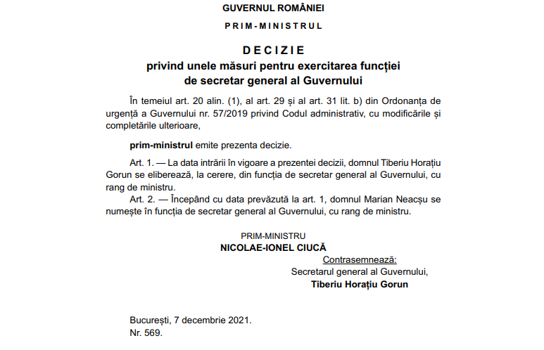 Acesta a fost numit în funcție prin decizia premierului Nicolae Ciucă, care a fost publicată marți în Monitorul Oficial. Prin aceeași decizie, Tiberiu Horaţiu Gorun a fost eliberat, la cerere, din funcția de secretar general al Guvernului, cu rang de ministru.