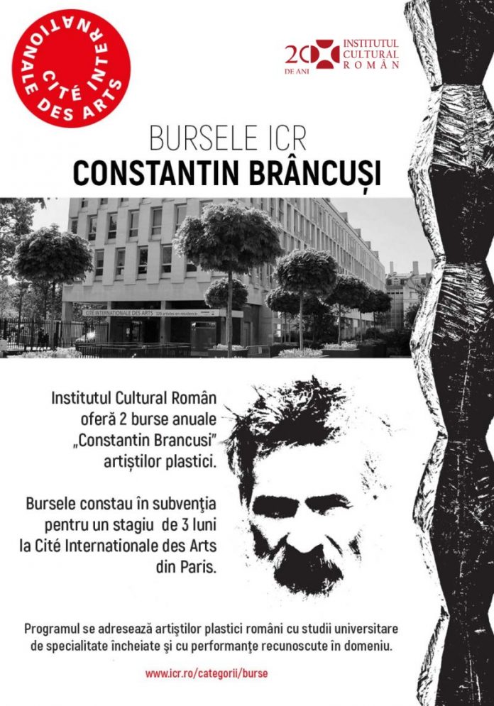 Obiectivul principal al programului de burse ,,Constantin Brâncuși” este introducerea artiştilor români în circuitul valorilor europene, prin oportunitatea de a lucra într-un mediu artistic internaţional. Programul se adresează artiştilor plastici/vizuali români cu studii universitare de specialitate încheiate şi cu performanţe recunoscute în domeniu. ,,Invităm artiștii interesați să trimită dosarele de candidatură până pe data de 17 noiembrie 2023, ora 16.00, la adresa de e-mail burse@icr.ro. Sunt oferite anual două burse Constantin Brâncuşi pentru perioade de câte trei luni, în vederea desfăşurării unor proiecte artistice în atelierul dedicat României la Cité Internationale des Arts, Paris-Franța. Valoarea fiecărei burse este de 6.000 de euro”, au transmis reprezentanții ICR. Selecţia este făcută de o comisie independentă de specialişti, personalităţi recunoscute în domeniul artelor plastice/vizuale, pe baza dosarelor de candidatură primite. Criteriile de evaluare sunt relevanța activităţii artistice de până acum (expoziţii, recomandări, dosar de presă), proiectul ca atare, calitatea proiectului propus în raport cu locul de desfășurare, fezabilitatea proiectului în intervalul bursei, caracterul inovativ al proiectului în contextul experienței artistice anterioare, contacte relevante în locul de desfășurare al bursei. Dosarele selectate sunt trimise spre validare Comisiei de admitere de la Cité Internationale des Arts. Perioadele de desfășurare a burselor sunt: mai – iulie 2024; noiembrie 2024 – ianuarie 2025.