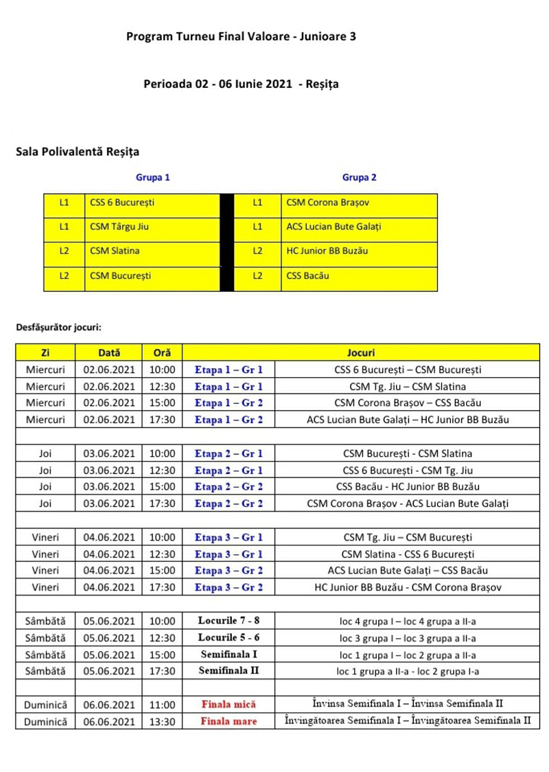 Handbalistele junioare de la CSM Târgu Jiu au fost repartizate în Grupa 1 la Turneul Final. Întrecerea se va desfășura în Sala Sporturilor din Reșița, în perioada 2-6 iunie. Sportivele conduse de Andrei Enache nu au avut o tragere la sorți foarte prietenoasă. Junioarele 3 o vor avea în față din nou pe CSM Slatina, formația pe care au învins-o de două ori, dar și două echipe foarte puternice din București: CSS 6 și CSM. ACS Lucian Bute Galați, CSS Bacău, CSM Corona Brașov și HC Junior BB Buzău sunt celelalte formații participante la competiție. Coordonatorul secției de handbal, Dan lieș, a recunoscut că urmează confruntări extrem de dificile. Totuși, oficialul clubului gorjean insistă că fetele trebuie să evolueze relaxate. „Din punctul meu de vedere, această grupă este una foarte puternică. Vom înfrunta pe CSS 6 București, echipa campioană națională la Junioare 4, CSM București, o echipă cu pretenții la medalii, și CSM Slatina, o echipă destul de redutabilă. Anticipez o bătălie încrâncenată pentru primele două locuri, care duc în semifinale. Avem o echipă unită, cu jucătoare talentate și sunt sigur că vom face un turneu bun. Ne bucurăm că am ajuns la Turneul Final. Nu a fost ușor, pentru că suntem un club la început de drum, dar serios şi care vrea să facă performanță, iar pentru rezultatele din ultima perioadă s-a muncit mult. Obiectivul echipei noastre rămâne același: să creștem în valoare de la meci și să jucăm cu zâmbetul pe buze. Acest turneu este un prilej foarte bun de a vedea la lucru cele mai bune echipe din România la această categorie de vârstă și sunt sigur că această experiență, aceste meciuri, grupa din care facem parte, o să ne ajute mult în dezvoltarea familiei CSM Târgu Jiu!”, a apreciat expertul sportiv. Fetele lui Andrei Enache au reușit performanța de a ajunge între cele mai bune opt echipe din țară la doar al doilea sezon competițional.