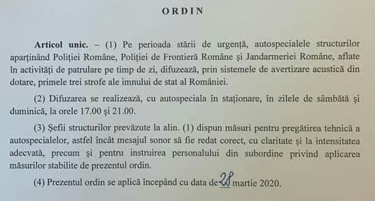 Totul s-a desfășurat în baza unui ordin dat, sâmbătă, de ministrul Internelor, Marcel Vela, care prevede difuzarea imnului național din mașinile Poliției Române, Poliției de Frontieră și Jandarmeriei Române, în zilele de sâmbătă și duminică, la ora 17.00 și 21.00, pe perioada stării de urgență.