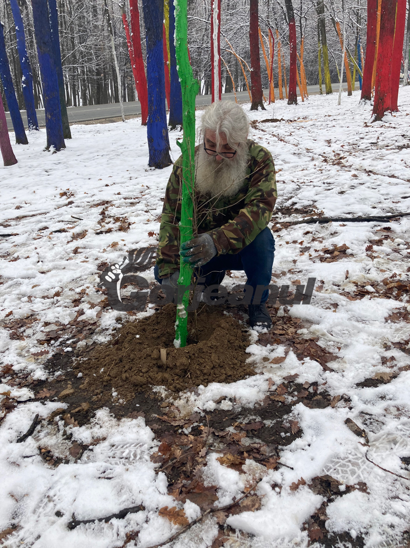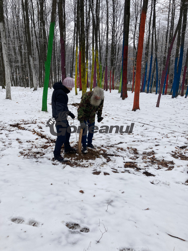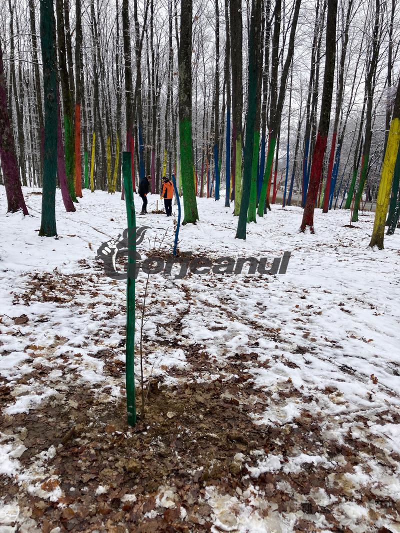 „Să dea Dumnezeu să apuc peste vreo 20 de ani să vopsesc și acești arbori. Deocamdată facem un gest reparatoriu, normal. Toată lumea ar trebui să planteze un copac. Eu am plantat cel puțin 100 până acum. Cei care se bucură de natură ar putea să ia câte o ghindă și să o pună în pământ pentru că din ea va crește un stejar, ceea ce e extraordinar. La noi aici poate nu se vor prinde toți cei 30 plantați, dar și 15 dacă prind rădăcini va fi extraordinar”, a spus maestrul Țopescu. Alături i-au fost colegi din filiala județeană a Artiștilor Plastici, președintele Vasile Fuiorea fiind printre cei care au înlocuit pensula cu cazmaua pentru câteva zeci de minute. „Fiecare artist încearcă să planteze în Pădurea Colorată un copăcel însoțit de un semn al simțului nostru estetic și artistic. Vrem să tragem un semnal de alarmă, pentru ca pădurea să continue să existe. E un proiect început de Mihai Țopescu și continuat de grupul Manifest, prin membrii filialei județene a UAP Gorj. Dorim să redăm publicului frumusețea silvestră de aici, ușor schimbată în paradigma asta a Land-artului. Acum e o frumusețe deosebită pentru că a și nins, iar culoarea copacilor e înnobilată”, a spus și Fuiorea. Totul s-a întâmplat sub privirile turiștilor care chiar și în această perioadă vin în număr mare. Un autocar a oprit aici pentru ca zeci de oameni să își poată face fotografii cu arborii vopsiți în urmă cu trei ani pentru a atrage atenția asupra defrișărilor ilegale. „Este un loc extraordinar, care arată și mai spectaculos acum, că a nins puțin. Am trecut și vara pe aici, când e totul verde, dar acum e și mai frumos. Am văzut că s-au plantat niște copăcei, dar cel mai mult mi-au plăcut cuiburile pentru păsărele. Sunt colorate și ele și asta face locul și mai frumos”, a spus un turist.