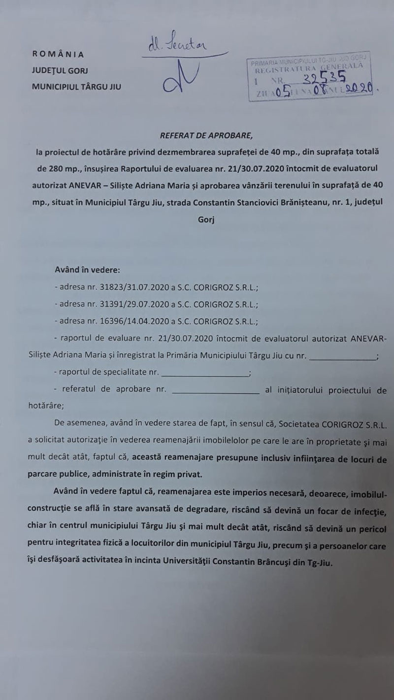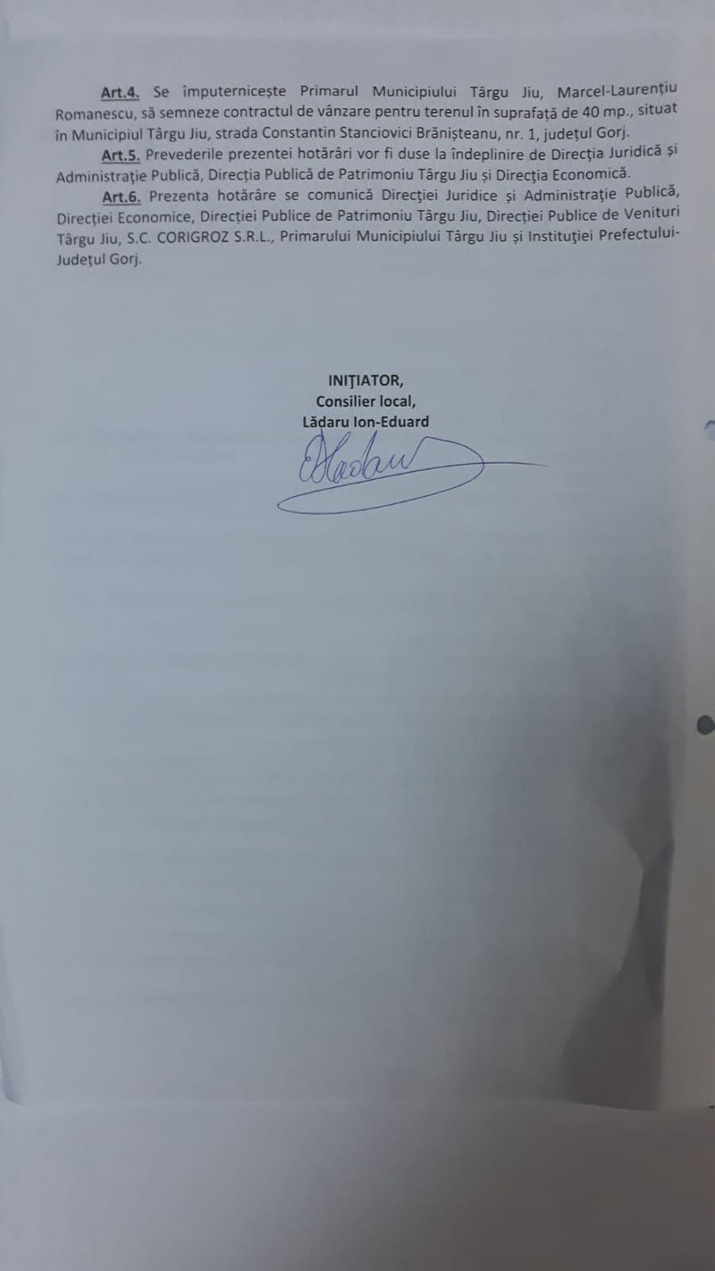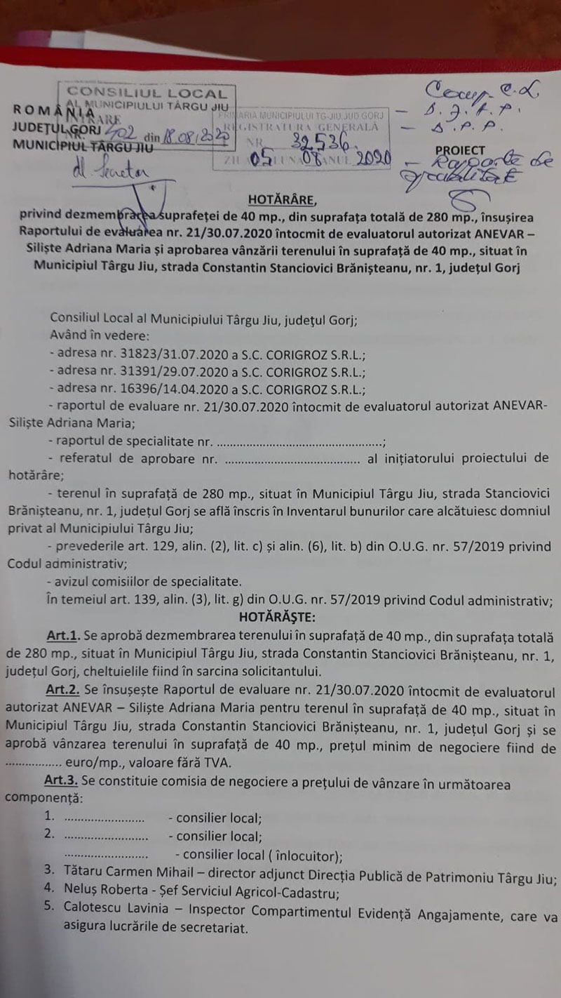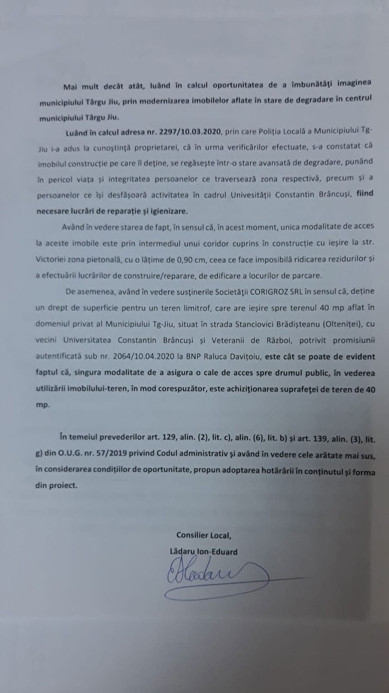Consilierii locali de la PSD au propus spre aprobare în ședința de luni a organismului de conducere municipal vânzarea a 40 mp de teren, situat pe fosta stradă Oltenița, chiar lângă Facultatea de Drept. Terenul ar trebui să fie dezmembrat, afectând atât o clădire a Edilitara Public, cât și clădirea în care funcționează Asociația Nevăzătorilor Gorj. Practic, dacă CL acceptă și aprobă acest proiect, fără să scoată terenul la licitație, familia de afaceriști Zidărescu, care deține deja două clădiri, una cu ieșire spre strada Victoria și cealaltă spre Bulevardul C-Tin Brâncuși, ar avea a treia ieșire spre fosta stradă Olteniței.