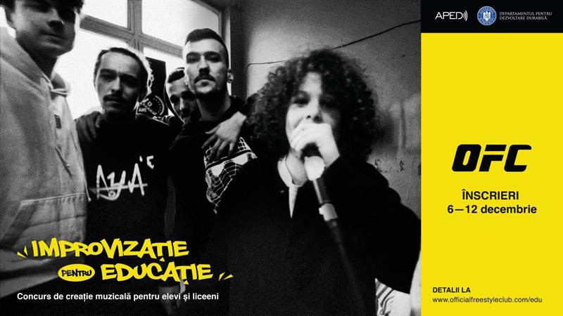 Elevii de gimnaziu şi liceenii din România sunt invitați să participe, până pe 12 decembrie, la „Improvizație pentru educație”, o competiție de creație muzicală pornind de la teme de educație puse în dialog cu dezvoltarea durabilă. Concursul, organizat de Official Freestyle Club România în parteneriat cu Asociația pentru Promovarea Educației Deschise, cu sprijinul Departamentului pentru Dezvoltare Durabilă, îşi propune să le arate tinerilor şi adulților cum instrumente şi tehnici contemporane de creație artistică pot fi utilizate inteligent în contexte de educație non-formală.