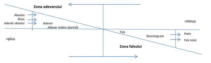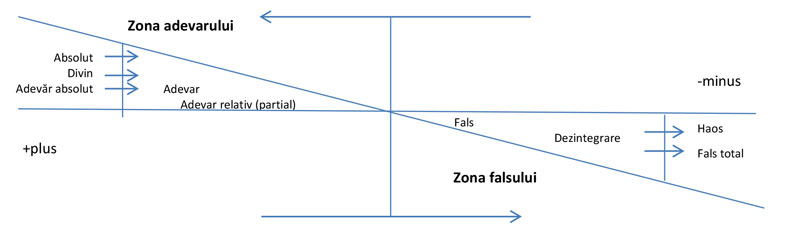 Absolut Divin. Adevăr absolut, adevăr relativ (parțial). Fals, Dezintegrare, fals total, haos. Următorul grafic ilustrează prezența sau absența adevărului în diferitele entități din lumea noastră. Prin entități înțelegem ceea ce noi numim simplu substantive, acțiuni. Ilustrăm de fapt, cum are loc evoluția. Adevărul absolut este modelul (pattern-ul, arhetipul, prototipul, matricea cosmică) ce generează celelalte adevăruri. El este teoretic și imaterial (ideal). Celelalte sunt copii materiale care conțin crâmpeie din adevărul absolut (care reflectă însușiri generale și esențiale ale entităților). Omenirea întrebându-se cine a creat și cine stăpânește adevărul absolut a dat naștere credințelor și religiilor deoarece forța rațiunii umane nu a putut ajunge la acest adevăr intangibil și nepalpabil. Acest adevăr absolut este, de fapt, Absolutul Divin pe care unii l-au numit Dumnezeu, alții Alah, alții Buda etc. în care diferite popoare cred. Diversificarea a mers mai departe căci creștinii s-au împărțit în ortodocși și catolici și au mai apărut și alte secte religioase, dar toate acestea nu sunt decât nuanțe ale aceleiași dorințe de cunoaștere și de venerare a Absolutului Divin. Până aici nu avem motive de îngrijorare dar când se ajunge la războaie, terorism în numele religiei deja e prea mult și ele trebuie oprite deoarece Absolutul Divin e unic și trebuie recunoscut de toți. Prin adevăruri, noi înțelegem orice ființă, lucru, plantă generate de Adevărul Absolut care pot fi percepute cu ajutorul simțurilor, plus abstracțiunile. Relativitatea e mai evidentă când intrăm în zona afirmațiilor: ,,oamenii se iubesc”, dar nu toți se iubesc.Există și aserțiuni aparent total adevărate. Ex: ,,Omul e muritor”, ,,Soarele încălzește”, ,,Pământul se învârtește”, dar ele sunt supuse erodării, fie și după miliarde de ani. Nu intrăm în zona politică să vedem dacă afirmațiile sunt adevărate.