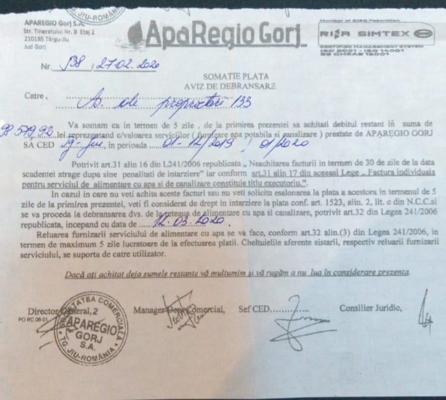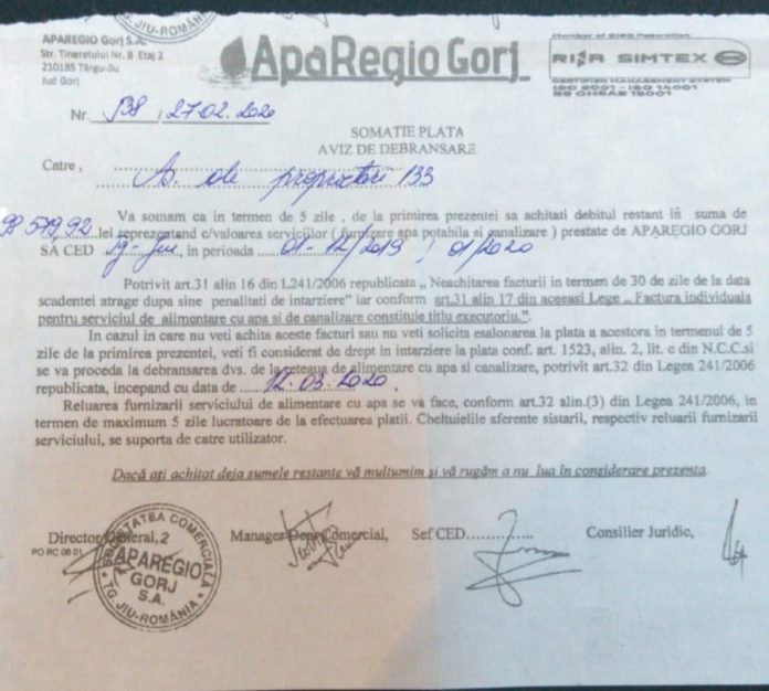 „Au apărut pe la scările unor blocuri din municipiul Târgu Jiu înștiințări de la societatea de apă și canal conform cărora urmează debranșări! În aceste momente dificile, în care se impun măsuri stricte de igienă, Aparegio vine cu amenințări către populație. Înțeleg că e nevoie de un buget uriaș ca să poată suporta salariile imense ale pilelor angajate acolo, dar să ajungi să ameninți oamenii pentru a strânge bani este înjositor. Oare unde sunt investițiile pe care societatea ar fi trebuit să le facă în oraș? Sper că Aparegio va renunța la amenințări în această perioadă foarte dificilă pentru noi toți. Consiliul Județean Gorj, Prefectura și chiar conducerea PSD, adică cei care îl susțin în funcție pe directorul Pătrășcoiu, ar trebui să se gândească, în primul rând, la cetățenii care acum traversează o perioadă extrem de dificilă!”, avertizează primarul municipiului Târgu Jiu, Marcel Romanescu.