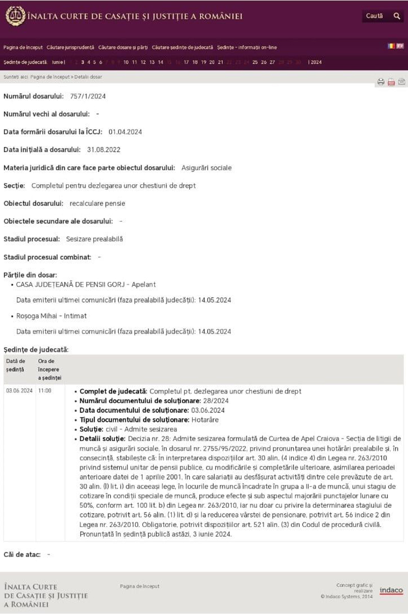 Iată soluția Înaltei Curți de Casație și Justiție: Admite sesizarea formulată de Curtea de Apel Craiova – Secţia de litigii de muncă şi asigurări sociale, în dosarul nr. 2755/95/2022, privind pronunţarea unei hotărâri prealabile şi, în consecinţă, stabileşte că: În interpretarea dispoziţiilor art. 30 alin. (4 indice 4) din Legea nr. 263/2010 privind sistemul unitar de pensii publice, cu modificările şi completările ulterioare, asimilarea perioadei anterioare datei de 1 aprilie 2001, în care salariaţii au desfăşurat activităţi dintre cele prevăzute de art. 30 alin. (l) lit. i) din aceeaşi lege, în locurile de muncă încadrate în grupa a II-a de muncă, unui stagiu de cotizare în condiţii speciale de muncă, produce efecte şi sub aspectul majorării punctajelor lunare cu 50%, conform art. 100 lit. b) din Legea nr. 263/2010, iar nu doar cu privire la determinarea stagiului de cotizare, potrivit art. 56 alin. (1) lit. d) şi la reducerea vârstei de pensionare, potrivit art. 56 indice 2 din Legea nr. 263/2010. Obligatorie, potrivit dispoziţiilor art. 521 alin. (3) din Codul de procedură civilă. Pronunţată în şedinţă publică astăzi, 3 iunie 2024.