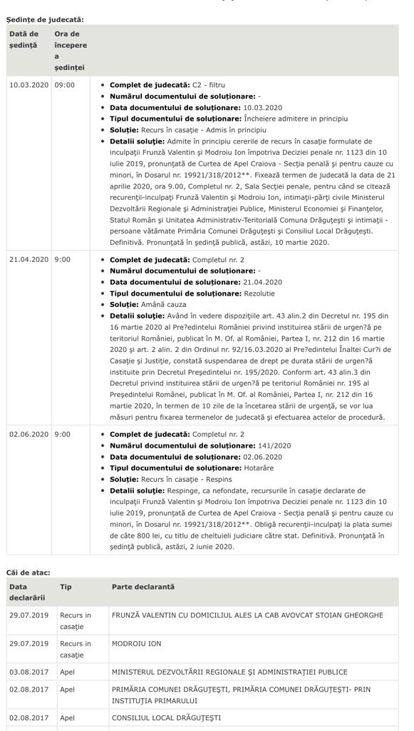 Ion Modroiu, fostul primar de Drăguțești, și afaceristul Valentin Frunză au rămas cu condamnările date la fond în 2012, deși ambii au făcut recurs împotriva sentinței Curții de Apel Craiova, date în iulie 2019, pentru că și această sentință ca și cea de la Judecătoria Târgu-Jiu, le-a fost potrivnică. Instanță Înaltei Curți s-a pronunțat pe 2 iunie 2020, respingând însă că nefondate recursurile celor doi, motiv pentru care ambii sunt buni de plată către Primăria Drăguțești. Aceștia au rămas, evident și cu condamnările cu suspendare primite la fond, cu opt ani în urmă.