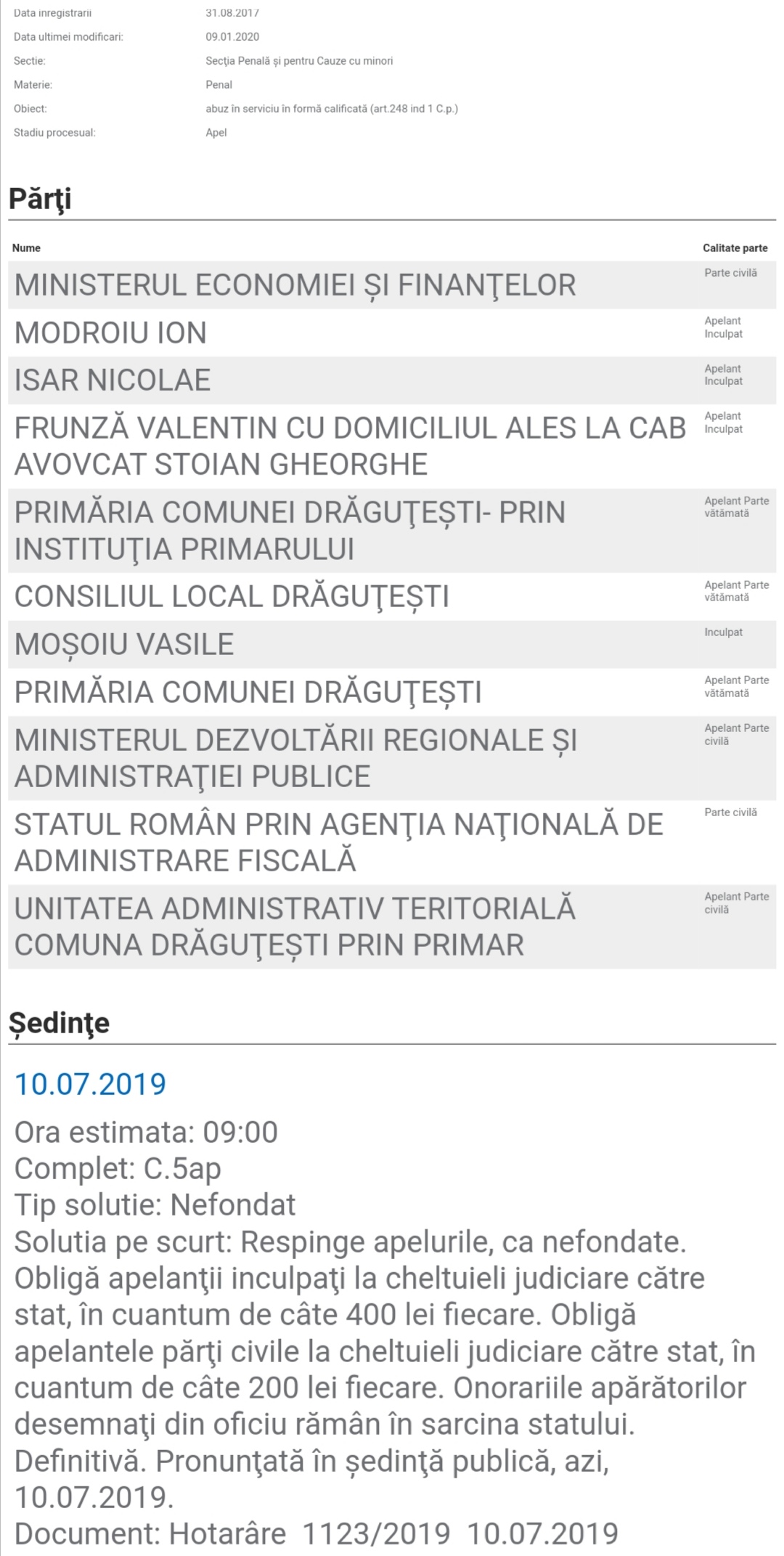 După opt ani de judecată, dosarul din 2012, în care a fost prejudiciat bugetul Primăriei Drăguțești, s-a încheiat. Instanță de fond a rămas în picioare, în timp ce doi inculpați, Modroiu și Frunză, nu au făcut decât să tragă de timp pentru a nu plăti banii înapoi UAT-ului.