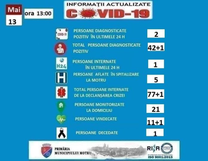 ”Pentru astăzi, situația privind pandemia de SARS-CoV2, până la ora 13.00, este următoarea: o singură persoană internată; doi dintre pacienți au fost diagnosticați pozitiv și transferați la Spitalul din Tg.Carbunești, ei având domiciliul în Covrigi și Văgiulești, ambii pensionari; alți cinci pacienți așteaptă primirea rezultatelor testelor; trei pacienți vindecați și externați, numărul total al persoanelor vindecate ajungând la 12; 29 de persoane fiind izolate la domiciliu”, a anunțat, aseară, Gigel Jianu, primarul municipiului Motru.