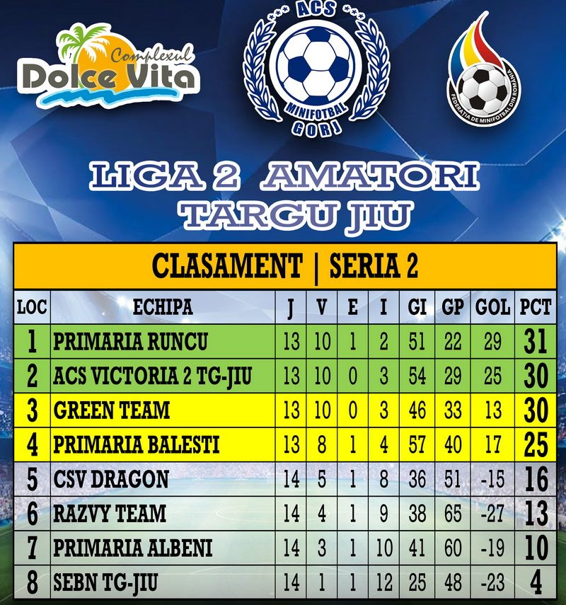 În Seria 2, jocurile care vor decide primele 3 clasate se joacă joi, de la ora 18.00. În meciurile disputate duminică, Primăria Albeni a bifat o victorie clară cu CSV Dragon, în timp ce Răzvy Team a trecut de SEBN Târgu Jiu. Toate aceste 4 echipe vor evolua în faza de Play-out.