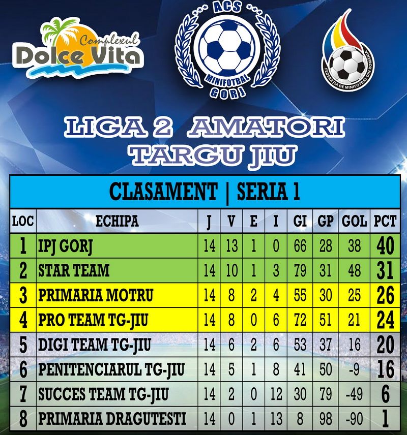 În Liga 2 Amatori au avut loc jocurile etapei cu numărul 14, ultima a sezonului regulat. În Seria 1 s-au încheiat calculele, IPJ Gorj și Star Team fiind echipele care merg direct în Play-off, în timp ce Primăria Motru și Pro Team Târgu Jiu vor disputa baraje de accedere în Play-off, cu echipele din Seria 2.
