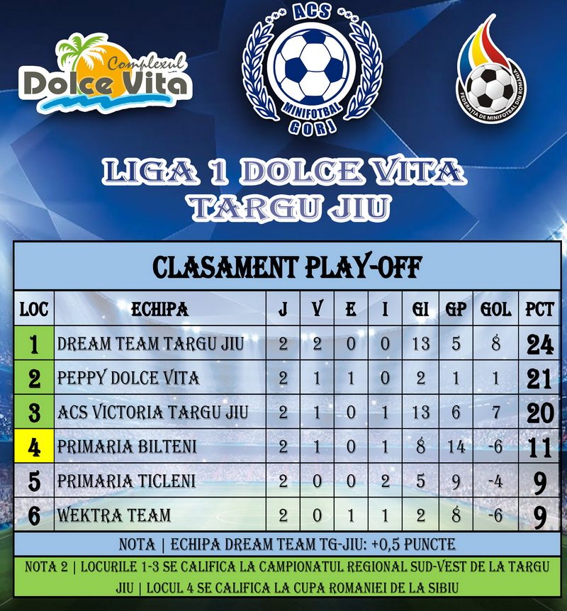 Dream Team a profitat și de remiza celorlalți rivali, de la Peppy Dolce Vita, care nu au putut trece de Wektra Team. În cel de-al treilea joc al etapei din play-off, Bîlteni s-a impus în fața celor de la Țicleni.