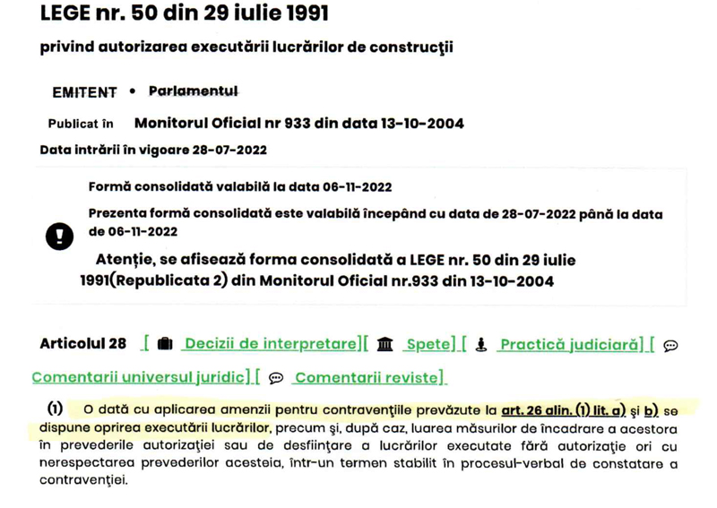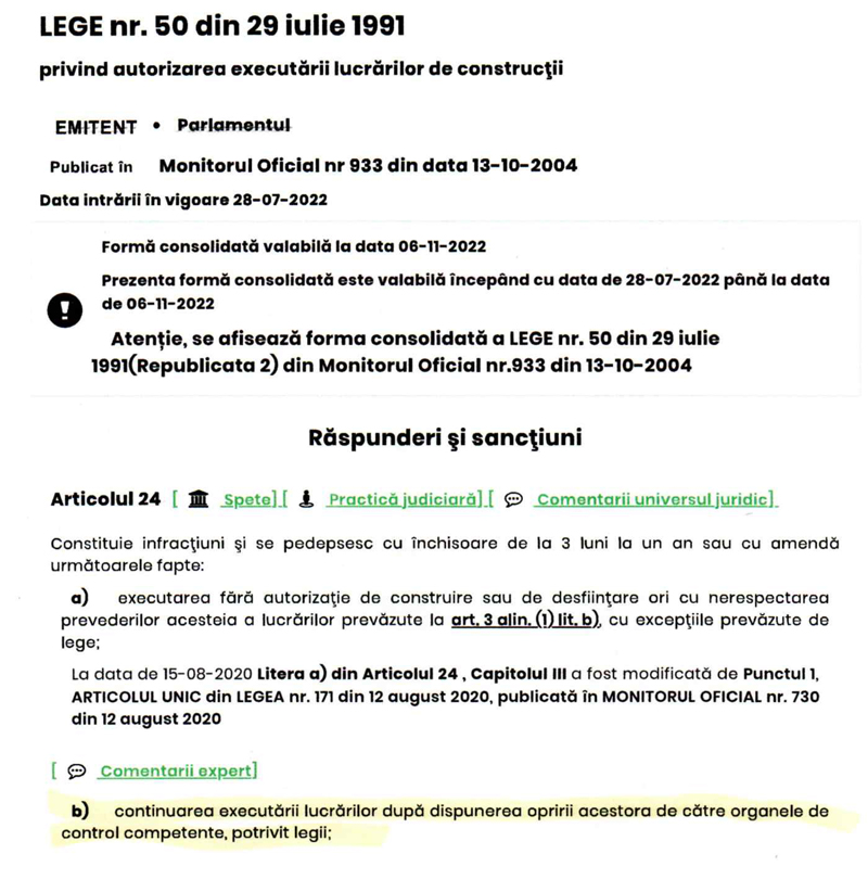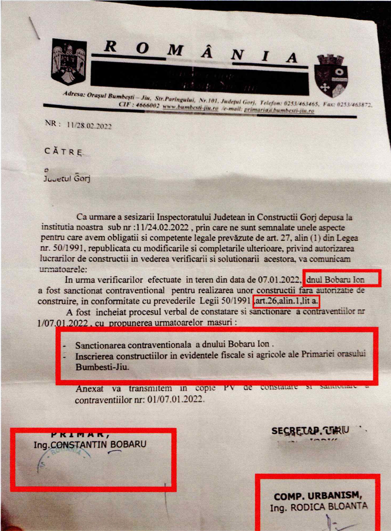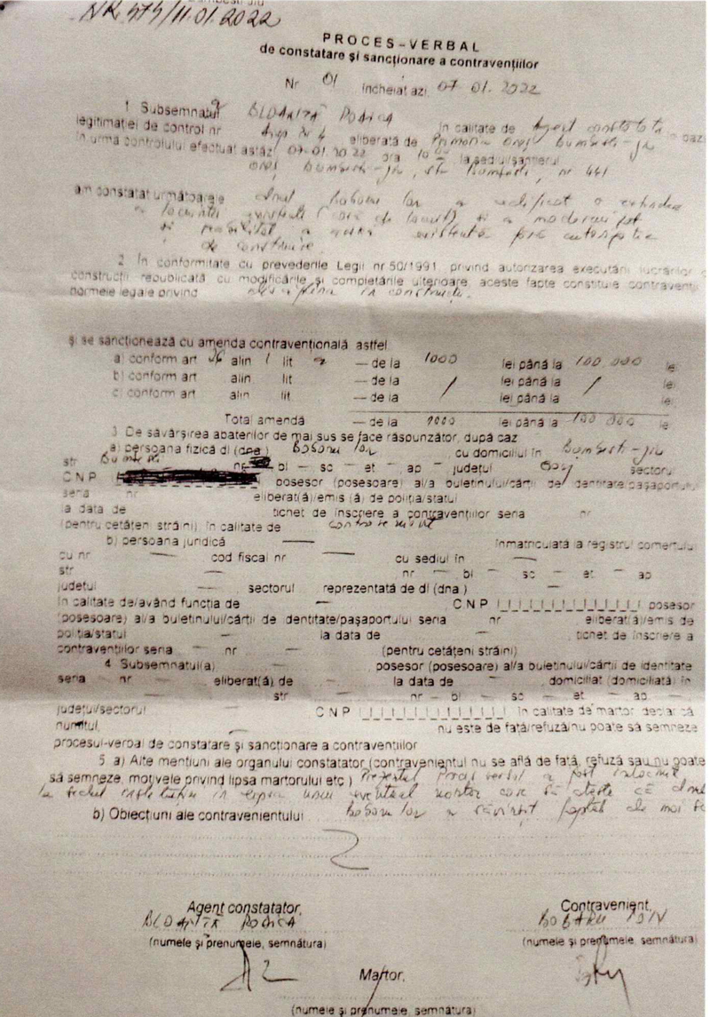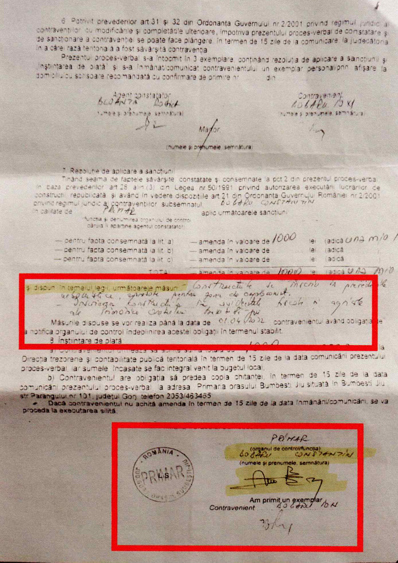 Cu ocazia controlului s-a confirmat încălcarea legii, fiind întocmit un proces-verbal prin care a fost aplicată o sancțiune contravențională de 1000 de lei pentru Ion Bobaru. Măsura este dată pe jumătate, deoarece nu se dispune, cu această ocazie, și sistarea lucrărilor conform art. 28 al 1 Legea50/1991.