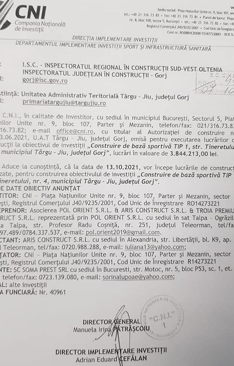 Primarul municipiului Târgu-Jiu, Marcel Romanescu, a anunțat că vor începe lucrările la baza sportivă a Universității ,,Constantin Brâncuși”. „Am fost anunțat oficial de Compania Națională de Investiții că a fost emis ordinul de începere a lucrărilor cu data de 13 octombrie.