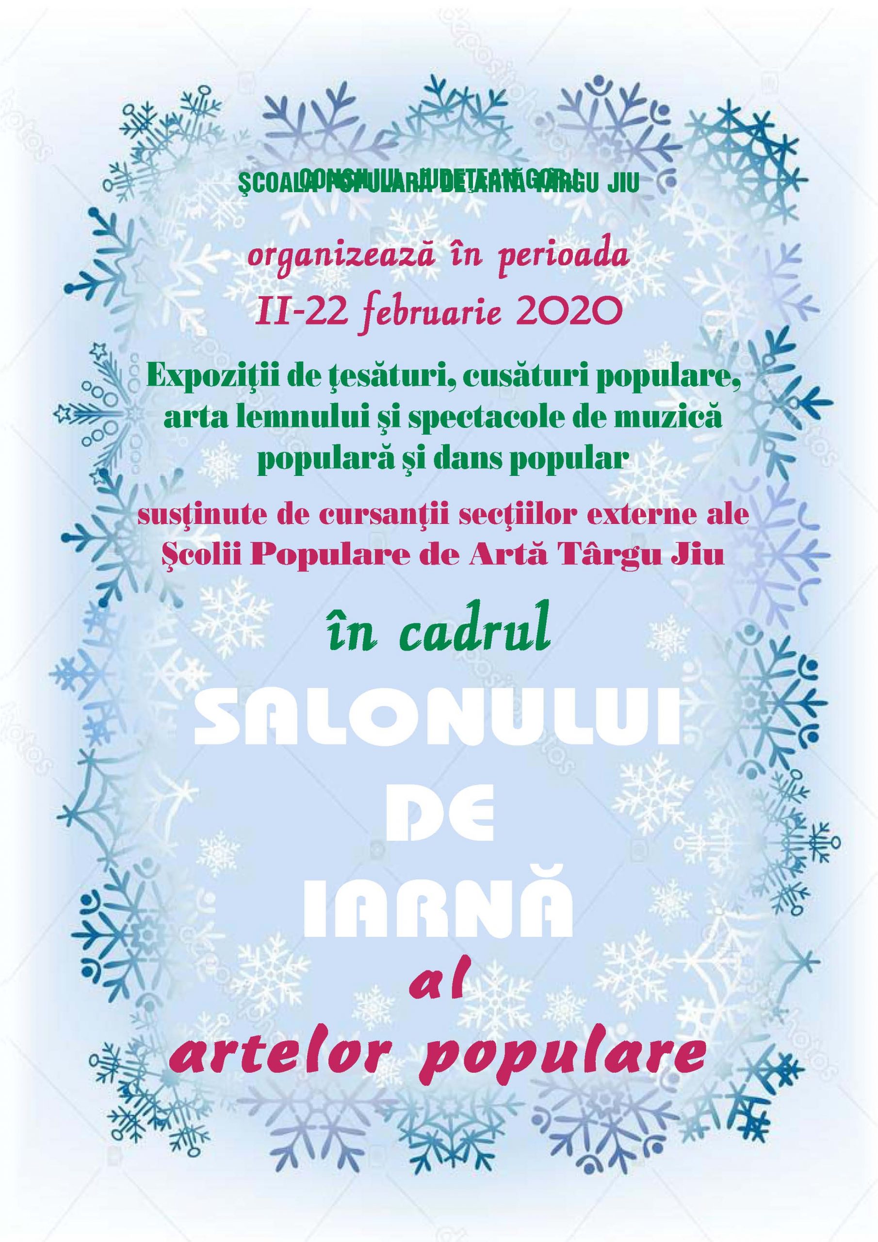 Școala Populară de Artă Târgu Jiu, instituție subordonată Consiliului Județean Gorj, organizează în luna februarie a fiecărui an „Salonul de iarnă al artelor populare”. În mai multe localități de pe meleagurile gorjenești au loc expoziții de meșteșuguri tradiționale, dar și spectacole folclorice oferite de cursanții secțiilor externe. Evenimentele se vor derula în perioada 11-22 februarie.