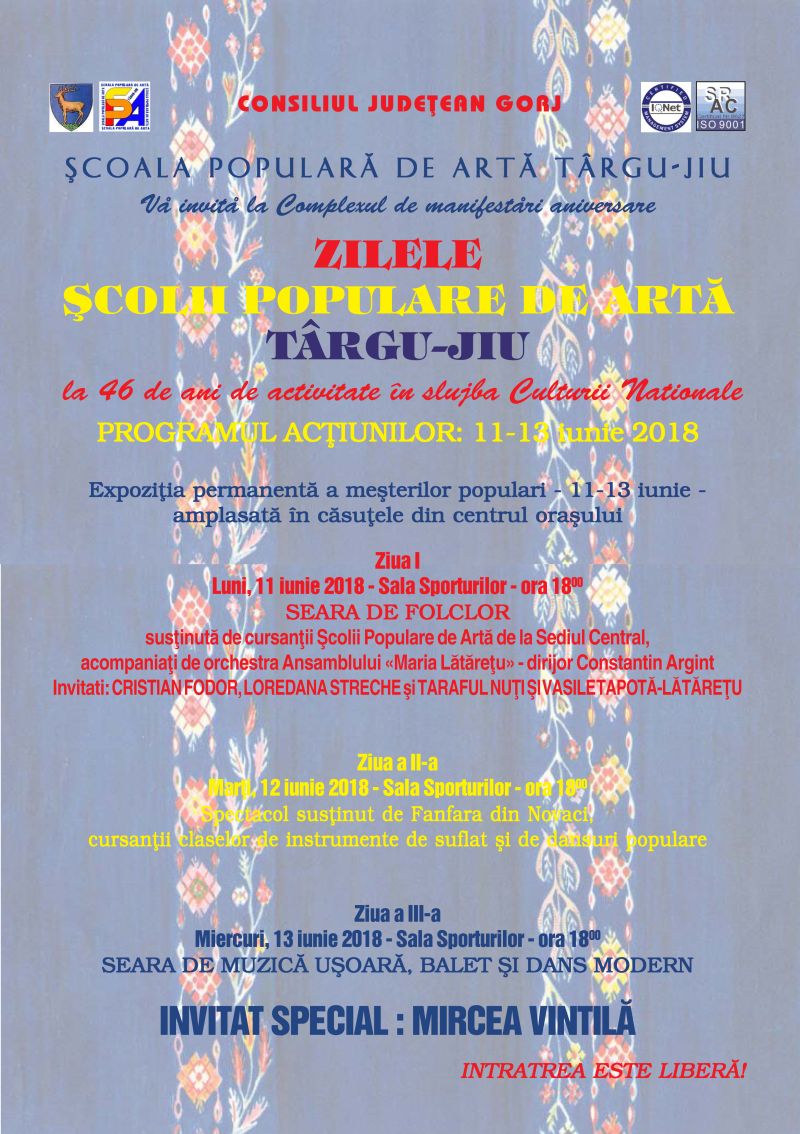 Programul din cadrul Zilelor Şcolii Populare de Artă promite a fi, şi anul acesta, unul de excepţie: luni, 11 iunie, începând cu ora 18.00 – iubitorii de folclor se vor bucura de recitalurile cursanţilor ŞPA Târgu Jiu, acompaniaţi de orchestra Ansamblului „Maria Lătăreţu”, dirijor Constantin Argint, dar şi de cele ale invitaţilor speciali – Taraful Nuşi şi Vasile Tapotă – Lătăreţu, Cristian Fodor şi Loredana Streche; marţi, ora 18.00 – un spectacol susţinut de cursanţii claselor instrumente de suflat, dansuri populare, precum şi de Fanfara din Novaci; miercuri, 13 iunie, 18.00, iubitorii de muzică uşoară, balet şi dans modern sunt aşteptaţi la un spectacol artistic plin de culoare, invitatul special al serii fiind Mircea Vintilă.