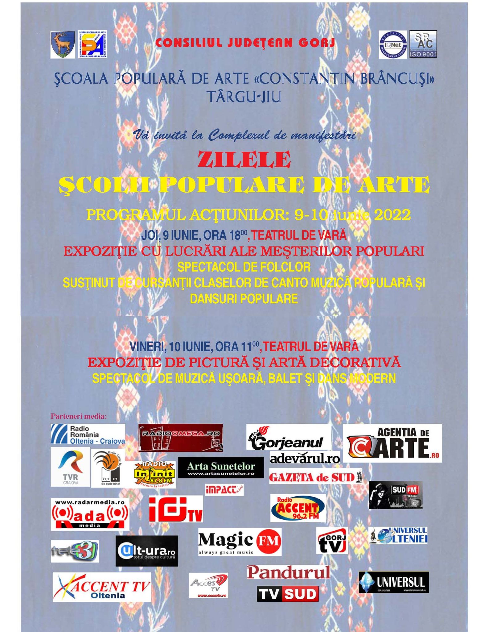 „Programul din cadrul Zilelor Școlii Populare de Arte promite a fi și anul acesta unul de excepție. Joi, 9 iunie, începând cu ora 18:00, o parte dintre cursanții claselor de canto muzică populară, coordonați de Maria Loga, Liliana Ciochină Neoagă, Claudia Dascălu, Raluca Elena Ghișe, Sofia Pleșu Munteanu, Nicoleta Lătărețu, Ion Drăgan, Ana Măgureanu, Grupul de vioriști «Virtuozii Gorjului», coordonați de Lucian Ciucă, Grupul de naiști și fluierași «Jiana», pregătit de prof. dr. Ștefan Popescu, vor susține recitaluri consistente, acompaniați cu profesionalism de orchestra de Ansamblului Folcloric «Maria Lătărețu», sub conducerea muzicală a domnului Constantin Argint”, anunță organizatorii.