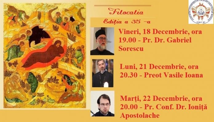 Asociația Studenților Creștini Ortodocși Români (ASCOR), filiala Târgu Jiu, a anunțat că, începând de vineri, 18 decembrie, se va desfășura cea de-a 35-a ediție a ,,Filocaliei”. Conferințele vor avea loc online, pe pagina de Facebook a ASCOR Târgu-Jiu, după următorul program: vineri, 18 decembrie, ora 19.00 – Pr. Dr. Gabriel Sorescu, luni, 21 decembrie, ora 20.30 – preot Vasile Ioana, marți, 22 decembrie, ora 20.00 – Pr. Conf. Dr. Ioniță Apostolache.