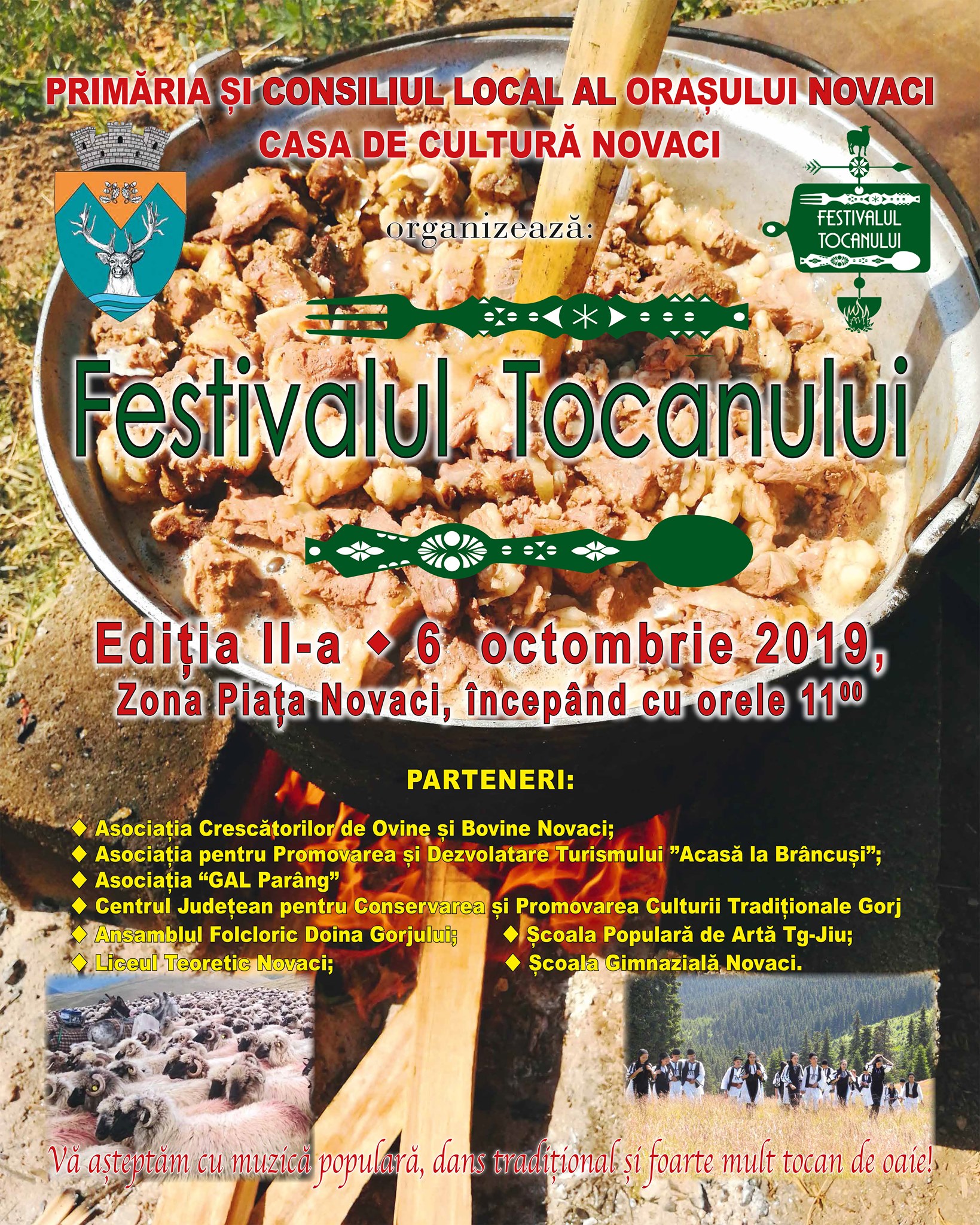 „Evenimentul se adresează tuturor acelora care doresc să își alimenteze sufletul cu entuziasmul unor oameni modești, simpli prin vorbă, port și acțiune, hotărâți, pe care nu-i poți înțelege decât dacă ai trăit alături de ei, dacă le asculti păsurile și le citești sufletul. Pentru fiecare cioban adevărat tocanul este preparatul culinar care presupune a avea carne de oaie de cea mai bună calitate. Oile sacrificate pentru tocan nu trebuie să fie neapărat tinere, trebuie să fie grase și sănătoase. Sacrificarea acestor oi nu se face pentru bani, ci pentru întinerirea turmei sau pentru a o micșora. Ciobanii autentici iubesc oile și le sacrifică rar, preferă să le vândă, uneori pe bani puțini decât să le vadă în agonia morții. Festivalul Tocanului este momentul în care concurența între ciobani atinge culmi nebănuite, pentru că fiecare dorește să aducă în fața oaspeților veniți la Novaci, produs de cea mai bună calitate. Prezența la festival este o mândrie de neam. Este exclus ca vechile familii de păstori să nu aibă reprezentanți. Acum este zarvă mare printre novăceni: cu pregătirea unor produse din lapte, cu pregătirea costumelor populare, cu transmiterea unor imagini ale propriilor turme pentru proiecții pe ecranele scenei. Se fac propuneri pentru programele artistice. Ca organizator nu poți decât să te bucuri când asculţi tot felul de propuneri, de idei, totul însemnând de fapt interes pentru sărbătoarea tradițională aflată la a doua ediție, Festivalul Tocanului. Dacă doriți să ne cunoașteți, să gustați renumitul tocan de oaie pregătit de către cei care cresc oile așa cum au învățat de la străbunici, dacă iubiţi dansul și cântecul păstoresc, veniţi la Novaci, duminică, 6 octombrie 2019! Petrecerea va începe de sâmbătă seara. Vă așteptăm cu voie bună și mult tocan!”, au transmis organizatorii.