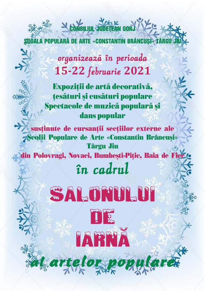 Școala Populară de Arte ”Constantin Brâncuși” Târgu Jiu organizează în fiecare an, în luna februarie, „Salonul de iarnă al artelor populare”. Anul acesta, programul activităților cultural-artistice anunțate este următorul: