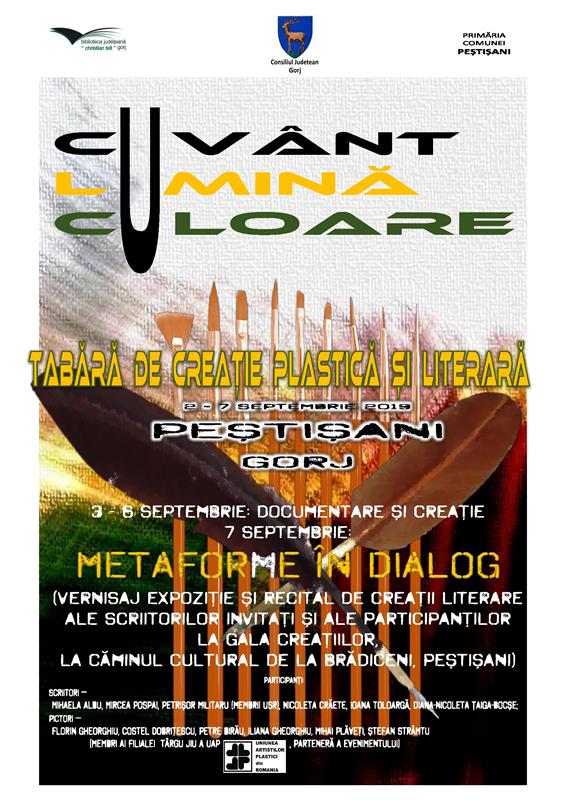 Tabăra de creaţie plastică şi literară are loc în perioada 2 – 7 septembrie, la Peştişani. Evenimentul este organizat de Consiliul Județean Gorj, Biblioteca Județeană ,,Christian Tell” Gorj, Primăria Peștișani în colaborare cu Filiala Târgu-Jiu a Uniunii Artiștilor Plastici din România. Proiectul cultural denumit ,,Cuvânt, Lumină, Culoare” are ca scop contribuția la valorificarea patrimoniului cultural creativ local și județean gorjean prin: – dezvoltarea de forme inovative de promovare a patrimoniului cultural gorjean pe baza dialogului dintre literatură și arte; – stimularea creativilor (scriitori, artiști etc) prin expunerea la patrimoniul cultural local; – susținerea dezvoltării de produse culturale care să contribuie la promovarea turistică a județului.