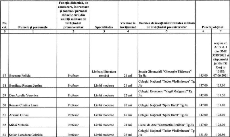 Nu m-aş fi înscris vreodată la acest concurs controversat, oricâte rezultate aş fi avut, dacă aş fi predat o altă limbă decât franceza, unde nu se fac meditaţii, dar neavând alte resurse de supravieţuire, am investit tot acest timp în proiecte şi competiţii, din care câştigă alţii, care nu au dus nici cinci la sută din greul pe care l-am dus noi, cei care le-am şi făcut. Până când voi primi un răspuns la atentatul de distrugere a omului care aduce valoare, voi sta alături de oamenii de serviciu din instituție, fiindcă nu îndrăznesc să mă alătur „elitelor”, după un clasament pe care nu-l pot accepta, fiindcă nu reflectă valoarea, nici evaluarea mea, ci o răzbunare fără precedent, izvorâtă din frustrare sau invidie, sentiment josnic pentru specia umană, incalificabil pentru intelectuali. Spun asta, pentru că ştiu ce presupune procedura şi pentru că la niciuna din specialităţi nu s-au tăiat, în duşmănie, puncte, aşa ca la departamentul limbi moderne, în special la franceză, şi mă simt discriminată, din acest punct de vedere şi din cele menţionate mai sus.