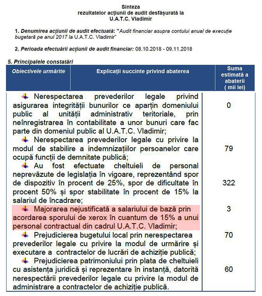Primarul comunei Vladimir, Ion Ianăşi, susține că aceste sporuri nu se mai dau de câțiva ani, deși auditul financiar face referire la anul de execuție bugetară 2017. „Noi nu mai dăm aceste sporuri. Ce-au constatat dânşii a fost prin 2013, acum nu mai dăm. Acel spor de xerox a fost dat prin dispoziție unui angajat, după care i s-a tăiat, nu a mai beneficiat de el. Era vorba despre un angajat care se ocupa de xerox, cred că undeva la 5-6 luni l-a încasat, nu mai ştiu exact. Nu se mai dau nici un fel de sporuri în prezent. Şi noi am recâştigat unele dintre ele în instanță, am avut hotărâri judecătoreşti. Dar acum, după noua lege a salarizării, nu s-au mai dat”, ne-a declarat primarul Ion Ianăşi, susținut de secretarul Constantin Enache. „Noi nu am mai avut sporuri din 2012, le-au imputat şi le-am lăsat naibii în pace. Este total greşit! Nu e spor de xerox, persoana care lucra la xerox a fost prinsă pe un spor de 15%, de condiții vătămătoare. Nu l-a primit mult timp, căci ni s-a defectat xeroxul”.