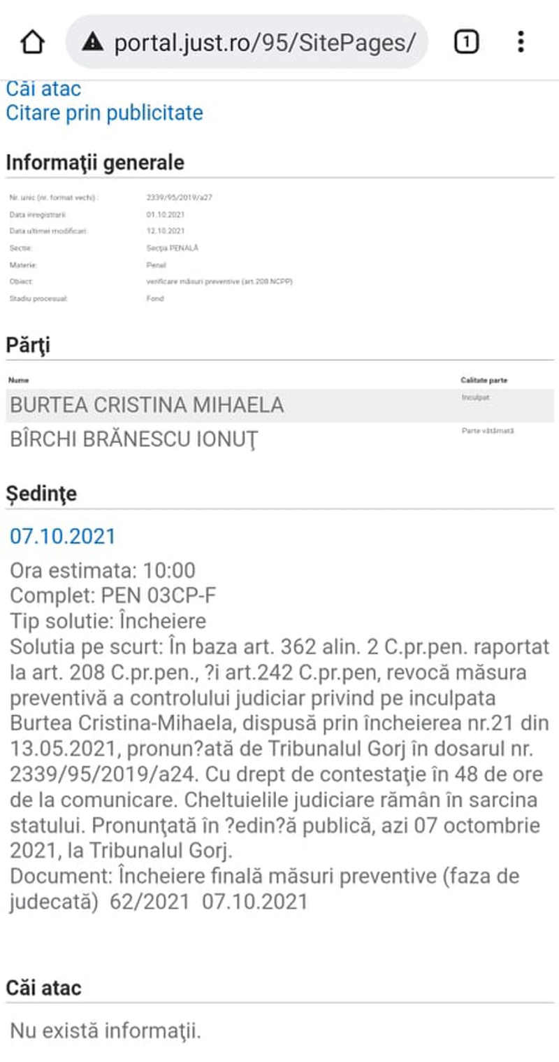 Cristina Mihaela Burtea, trimisă în judecată pentru tentativă de omor în 2019, după ce și-a înjunghiat cu un cuțit fostul concubin, a fost scoasă de sub control judiciar pe parcursul judecății. În favoarea inculpatei a intervenit faptul că aceasta a rămas însărcinată și a dat naștere, recent, unui copil. Femeia a stat după gratii opt luni, imediat după comiterea faptei, apoi a fost în arest la domiciliu peste un an, apoi o lună sub control judiciar, iar acum este liberă. Sentința a fost dată pe 7 octombrie la Tribunalul Gorj-Secția Penală.