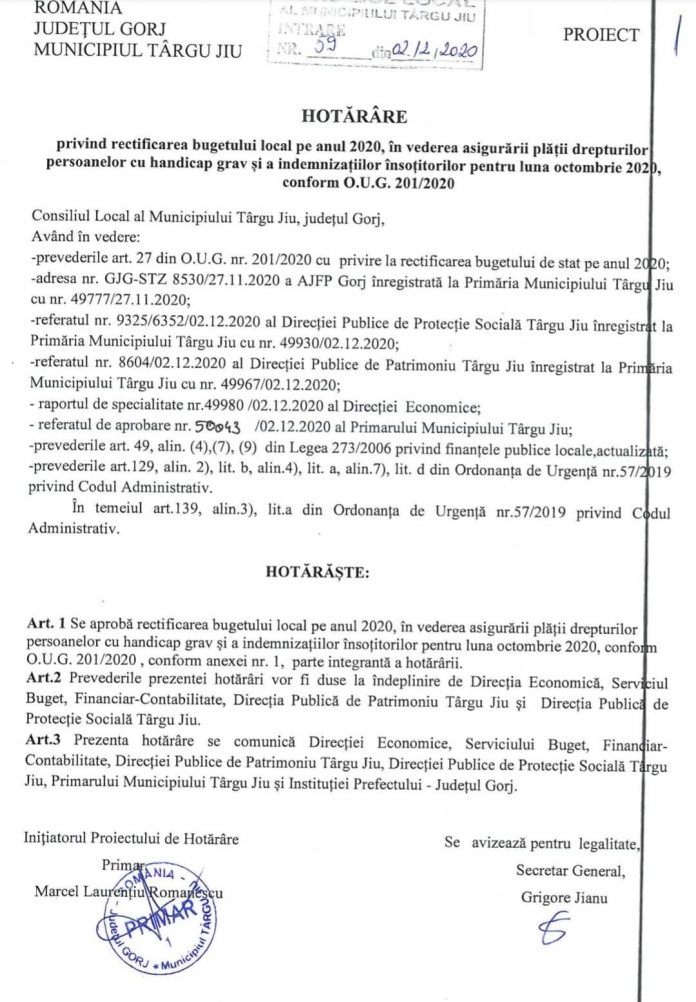 „Drepturile persoanelor cu handicap grav și indemnizatiile însoțitorilor acestora vor fi achitate în perioada imediat următoare din economii pe care le-am făcut la bugetul local. Cei în drept vor primi banii până cel târziu luni. Am făcut unele economii la buget și, printr-o rectificare votată astăzi în consiliul local, am decis alocarea sumelor necesare pentru că nu-i puteam lăsa pe acești oameni fără bani acum, în preajma sărbătorilor”, a anunțat Marcel Romanescu, primarul municipiului Târgu Jiu.